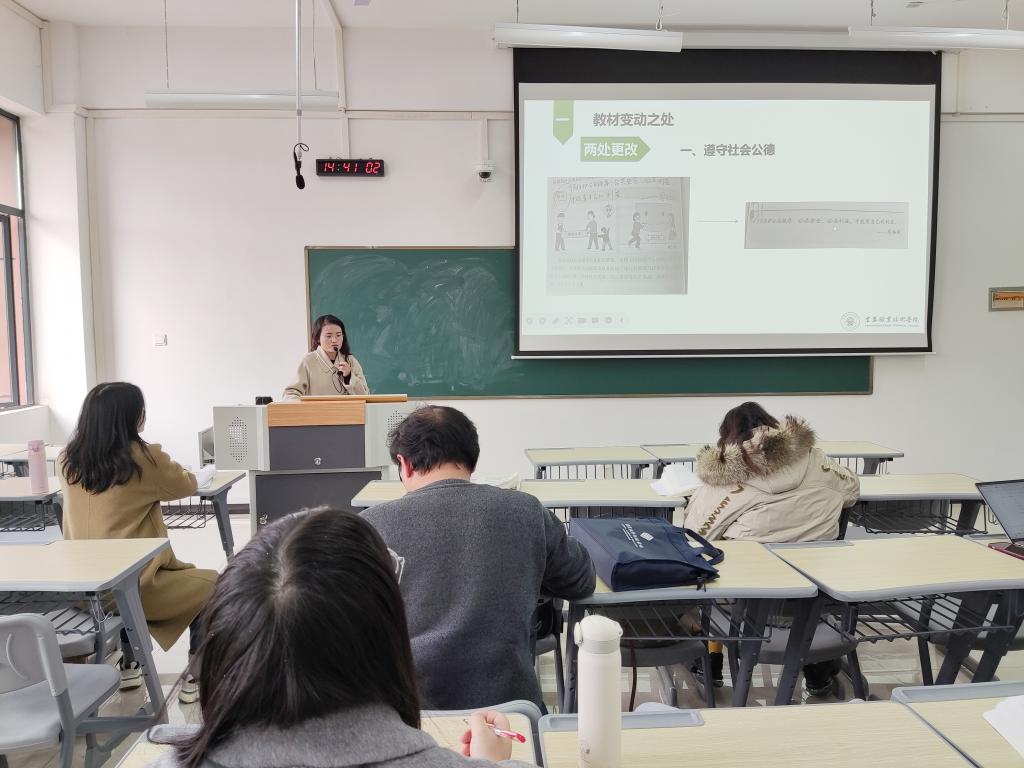 本次备课会分为三个部分。第一部分,由备课教师黄斌军和南丹进行说课,立足于教材本身,从“新旧教材对比” “教学目标的设定”“案例的选择”“重难点的突破”四个方面进行分析解读,并结合自己备课过程和授课经历提出相关问题。第二部分,参会教师对两位教师提出的问题以及上课过程中实际遇到的问题进行热烈讨论。张正芳从导入方式和授课内容两个角度提出建议;张保揭对道德产生的三个根源进行分析;李继民也结合自身的授课经验提出相关的见解。最后,胡金兰对本次教研会上各位教师的建议和分享进行总结,并针对课程结课时间和考试要求提出相关要求。