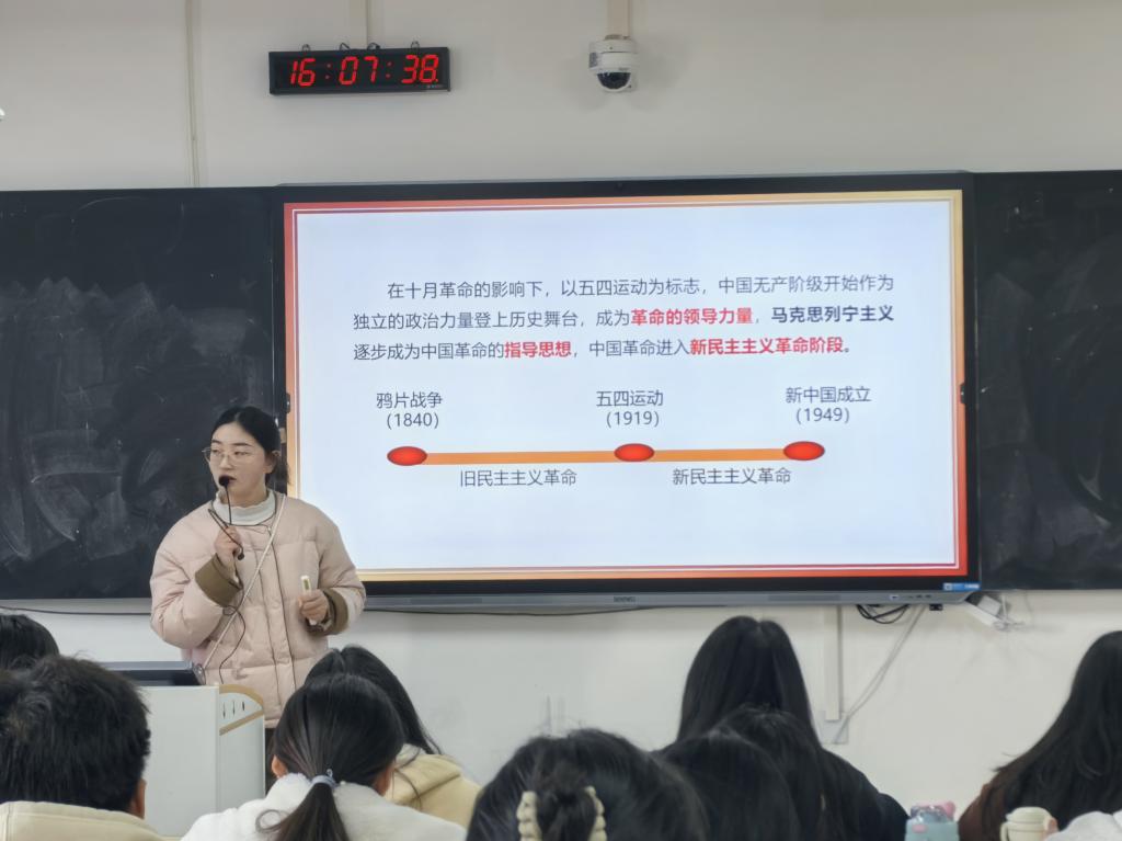 本站讯(马克思主义学院 南丹)为充分发挥思政课作为立德树人关键课程作用,3月18日下午,马克思主义学院在和济楼C209开展公开课教学观摩活动,由青年教师刘恋主讲,聚焦专题三《新民主主义革命理论何以形成?》展开示范教学。
