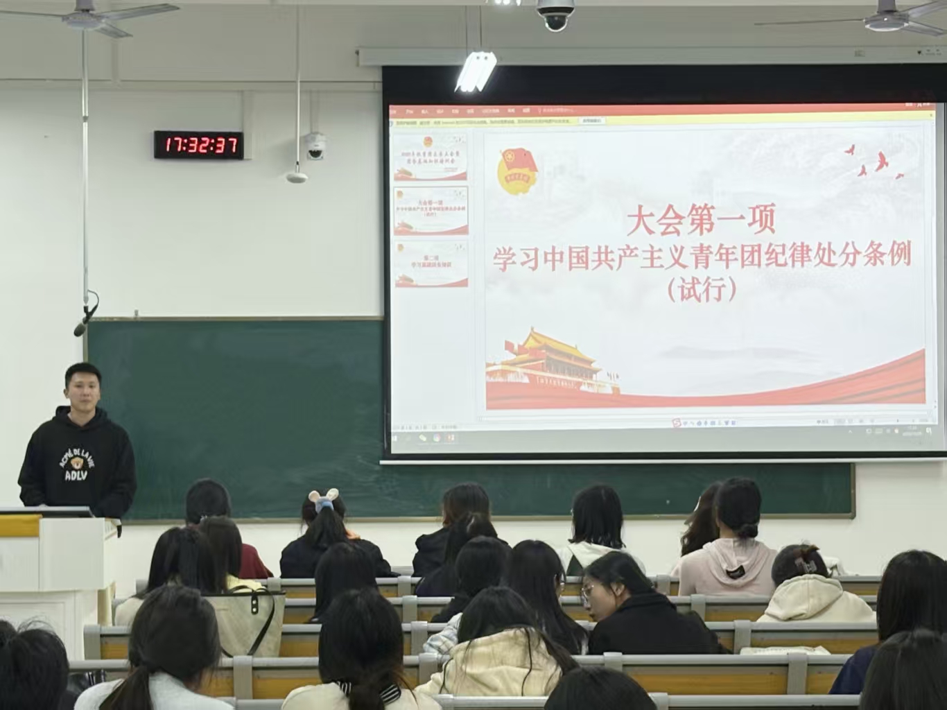 会议围绕专题学习与工作指导两大核心议题进行开展。霍文杰带领学习《中国共产主义青年团纪律处分条例(试行)》。他以条例内容为核心,逐章解读条例中关于团员纪律要求、处分情形及执行流程的关键条款。他强调,团支书作为基层团组织的“领头人”,不仅要带头学习团章团纪,更要引导班级团员自觉遵守团的纪律,筑牢团组织建设的纪律根基学院团总支副书记欧阳紫玲针对近期团务工作进行具体安排。她结合近期团内重点工作细致讲解,帮助团支书掌握实操方法,为后续团务工作高效推进提供指导。