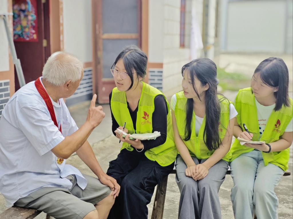 抵达当天,实践团队在驻村工作队成员陶钧的带领下走进村史馆,参观村灵芝产业园、唐家湾天井老屋等,深入了解通书院村的发展历程与特色风貌。在上门推普过程中,团队还走访慰问村内两位光荣在党50年的老党员余德森和邹俊林,聆听他们讲述红色故事,为其拍摄制作专题视频。