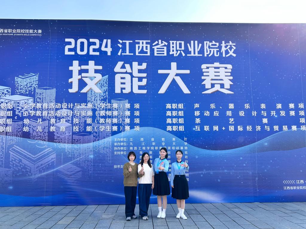 我院潘莎、陈艳辉老师所指导的同学杨欣怡、曾勤,在大学生英语应用能力赛项中分别荣获二等奖、三等奖;尹欣、项丽红老师所指导的同学廖泽艳、朱宁静在幼儿教育赛项(学生组)中荣获二等奖;教师陈柳在幼儿教育赛项(教师组)中荣获三等奖。