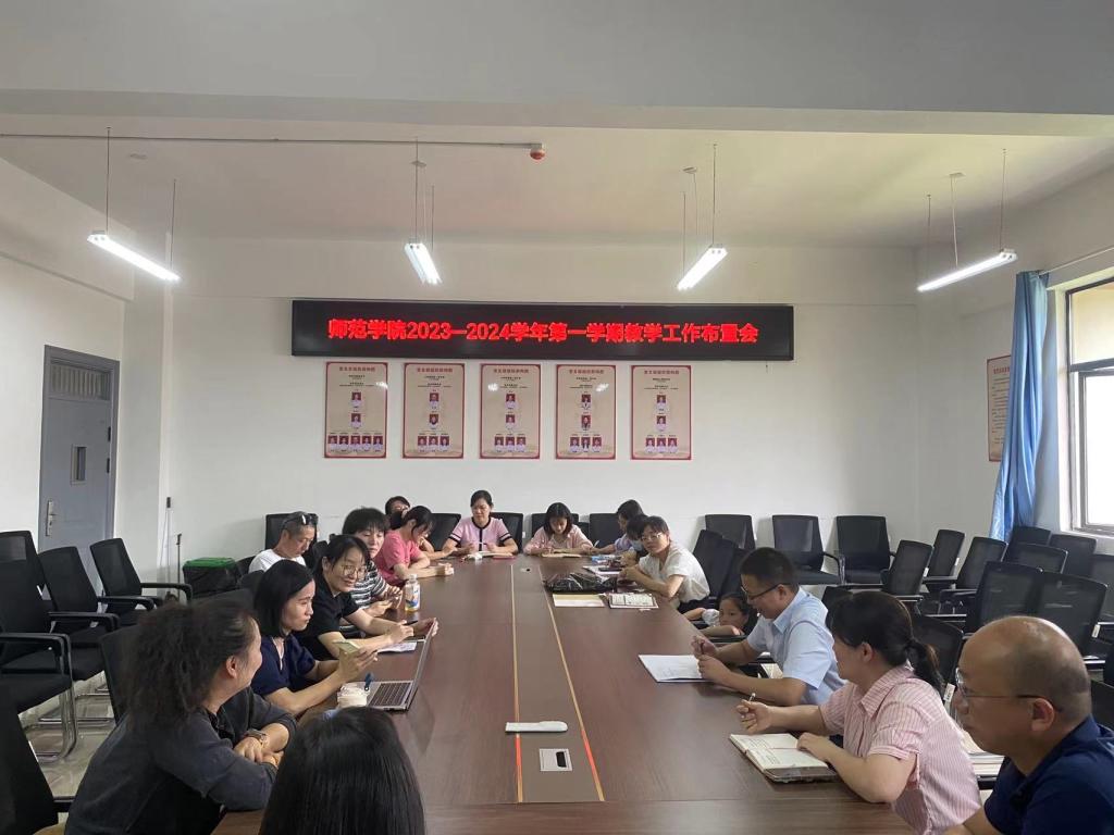 本站讯(师范学院 徐政)为保障新学期各项教育教学工作的顺利开展,8月31日下午,师范学院在正心楼党员活动室召开2023-2024学年第一学期教学工作布置会。党总支书记邹晓英主持会议,院长肖勇,副院长漆凡、袁军荣,教研室正副主任、专业负责人、教务科负责人出席会议。