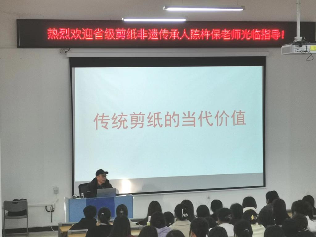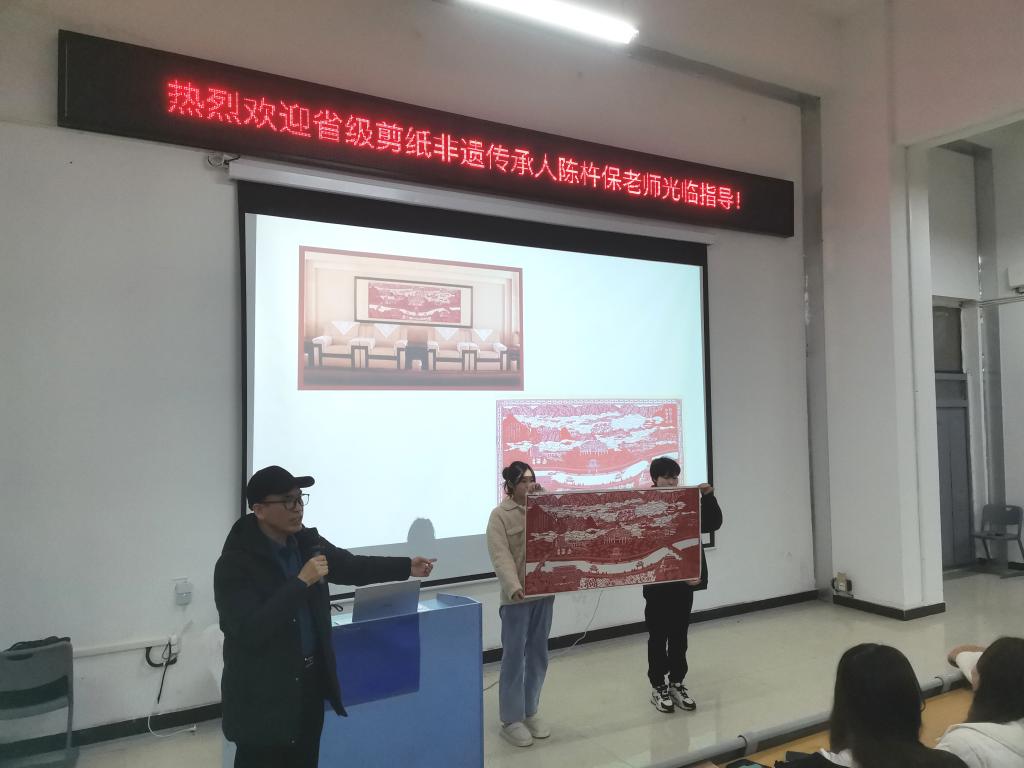 讲座中,陈杵保从剪纸的来源与发展,剪纸的当代价值等方面入手,给同学们作了深入浅出的讲解,并展示了很多个人剪纸获奖作品,激发了同学们对剪纸的兴趣,大家纷纷表示希望可以对剪纸进行更深入的了解。陈杵保幽默风趣的讲座得到同学们的热烈反响。讲座结束后,院党总支书记邹晓英为陈杵保颁发师范学院非物质遗产工作室特聘专家聘书,陈杵保向师范学院赠送大型剪纸作品《锦绣三都》,并对剪纸非遗传承工作室进行指导,后期将进行更深入的合作交流。
