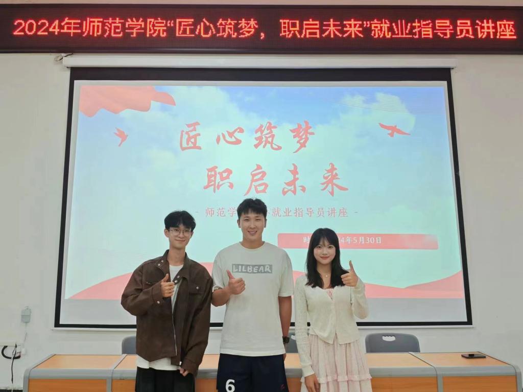 本站讯(师范学院 李静 学生记者 邓绍然)“职”面挑战,筑梦未来。为深入贯彻落实国家关于促进高校毕业生就业创业工作的决策部署,引导广大青年学生树立正确的择业观、就业观和职业观,进一步把握就业方向、找准职业定位、提升就业能力,5月30日,师范学院在正心楼A108开展“匠心筑梦,职启未来”就业指导员讲座。本次讲座邀请了师范学院优秀毕业生袁梦辉、汪静雯为各毕业班的学生代表进行经验分享。