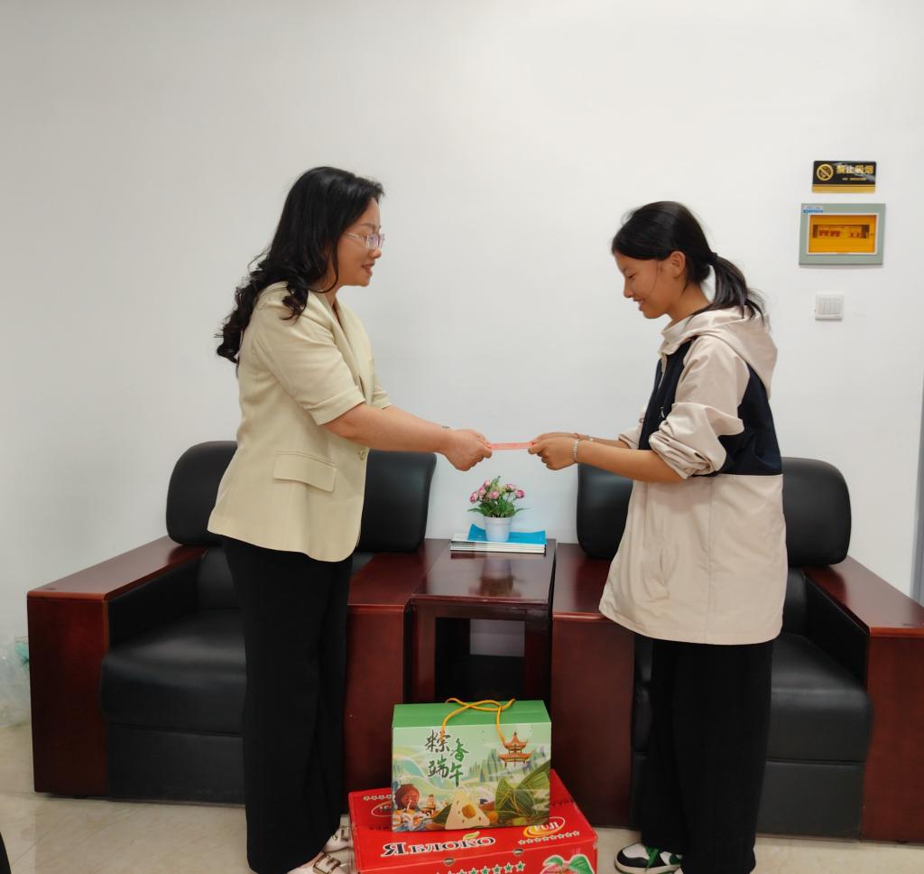 最后,院领导给受助学生送上慰问金、粽子和苹果等慰问物资。学生内心非常感动,并表示自己一定会努力学好专业知识,用实际行动报效学校对她的帮助