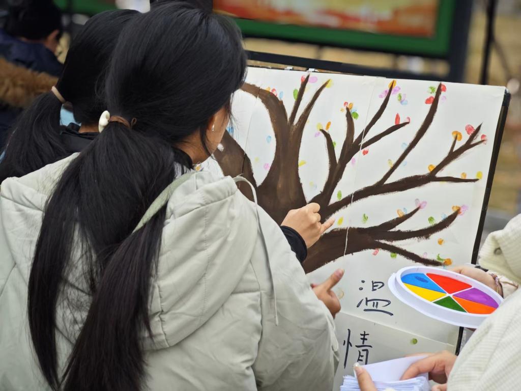 本次活动立足于大雪节气,将传统文化与现代元素相结合,鼓励同学们在活动中发挥创意。游戏打卡环节,同学们以指为笔,蘸取斑斓印泥,在“指纹树”上留下独特印记,共同绘制生命之树。在小雪人贴贴画活动区,同学们将写下的寄语与祝愿挂在吊牌上,写满祝愿的小雪人为冬日增添了温暖色彩。知识问答与断句挑战环节是智慧与趣味的碰撞,同学们反应迅速,纷纷抢答,在一个个奇妙长句中感受汉语言停连与顿挫的魅力,活动现场洋溢着欢乐温馨的气氛。