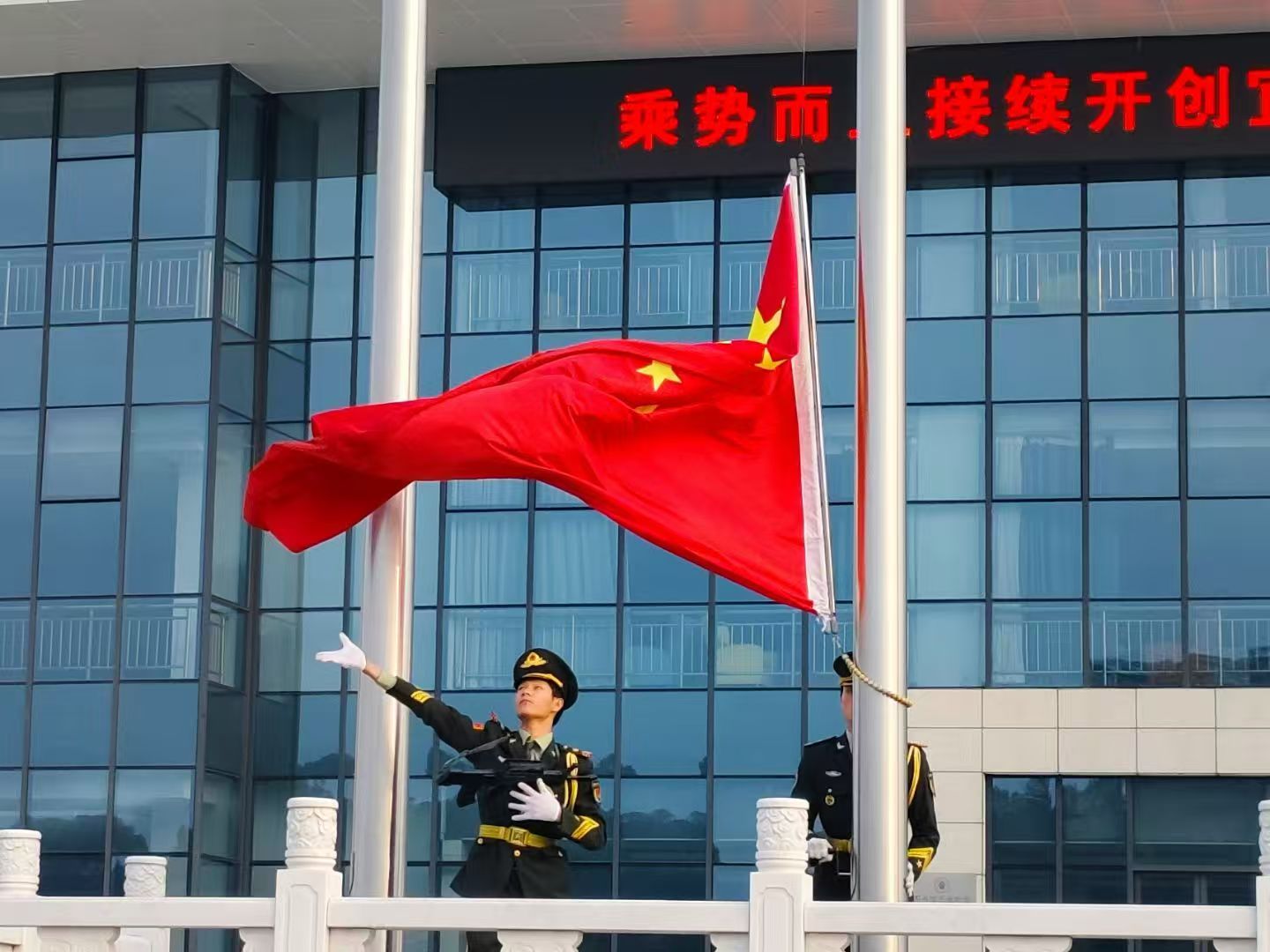 本站讯(师范学院 王焕 学生记者 龚洋涵 皮紫怡)为深入学习贯彻习近平新时代中国特色社会主义思想,深化爱国主义教育,激励广大学子争做“有理想、有道德、有文化、有纪律”的时代新人,3月17日,师范学院在开物广场举行“红星照耀宜职梦,青春筑梦启新程”主题升旗仪式。院党总支书记邹晓英,院长肖勇,党总支副书记任玉慧,副院长漆凡、杜欣宇以及23高小教班全体同学共同参加此次升旗活动。