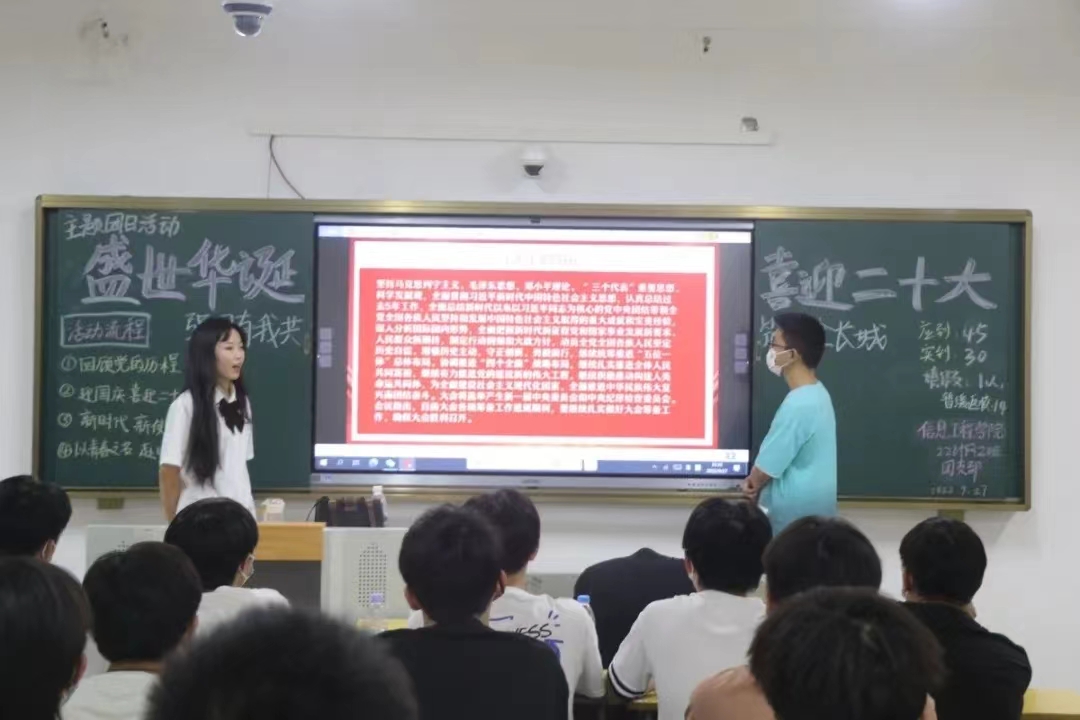 活动中,各班团支部紧扣主题,采用PPT展示、故事分享、情景演讲等形式多样化开展此次活动。此次的示范性主题团日活动由护理学院助产22301班承担,校团委全体工作人员、各学院团总支书记及各二级学院学生代表现场观摩了此次活动,同时此次示范性主题团日活动也在“宜春职院青年”视频号上进行全程直播,供全校师生观摩学习。活动围绕庆国庆、喜迎党的二十大,坚决捍卫国家安全三个部分灵活开展,以丰富多彩的节目将多个主题融会贯通。同学们通过观看学习强国平台相互交流心得体会,让大家重温了祖国在党领导下的百年奋斗光辉历程。随后,通过生动演绎《国家安全、人人有责》情景剧片段,引导着同学们领会国家安全人人有责、人人可为的深刻内涵,并通过大声朗诵《读中国》,在同学们的心中厚植爱党爱国情怀。活动最后,同学们铿锵有力、激情澎湃地合唱《我们都是追梦人》,表露出青年学子们必将肩负起实现中华民族伟大复兴重大历史使命的决心。活动结束后,校团委书记施旸从前期准备和活动程序上肯定了活动开展效果,活动环节紧凑有序、富有青春朝气,展现出了当代大学生奋发向上的时代风采,同时针对活动细节指出了不足及改进建议。她提出,要始终牢记习近平总书记的殷殷嘱托,希望更多青年学子尽展强国有我,奋进新时代的青春向党之心。