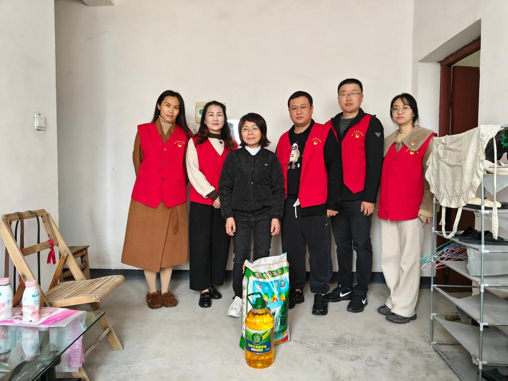 会后,党员们跟随社区工作人员,走访困难群众万女士。万女士今年52岁,无儿无女无工作,低保户,现居住在公租房。同志们与万女士交谈,了解她近期的生活情况、身体状况,以及当前遇到的困难,并为她送来大米、食用油等生活用品。万女士十分感谢大家的关心和关怀,也表示会努力找工作,有困难会及时向大家反馈。