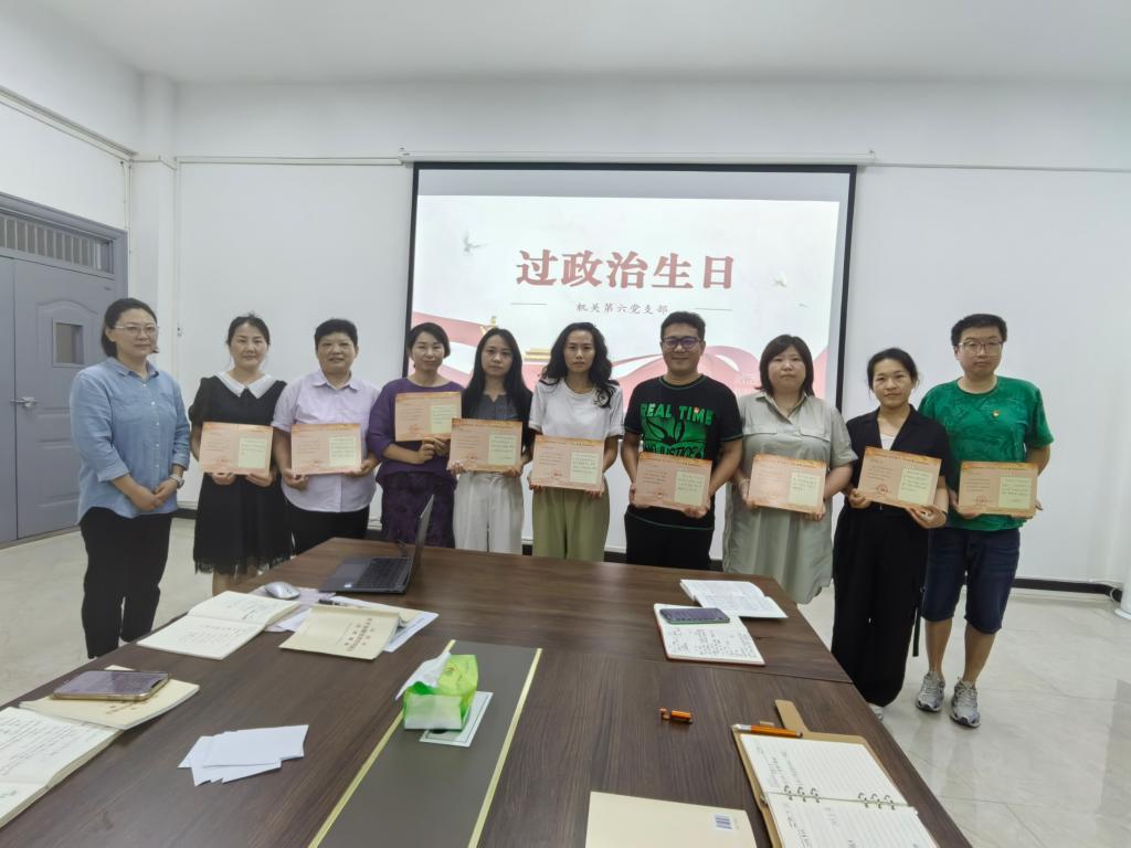 会上,支部开展专题学习,并为谢海英、杨文姝等9名同志过“政治生日”。张彩凤同志代表支部向他们颁发“生日贺卡”。谢海英同志发表生日感言:“今年是我加入中国共产党第30个年头。30年前入党的场景记忆犹新。入党,是我信仰的选择,是我一生的承诺。感谢党对我的关怀、教育和培养。我将永远牢记初心与使命,在工作中勇于担当作为,以实际行动为党旗添光加彩。”