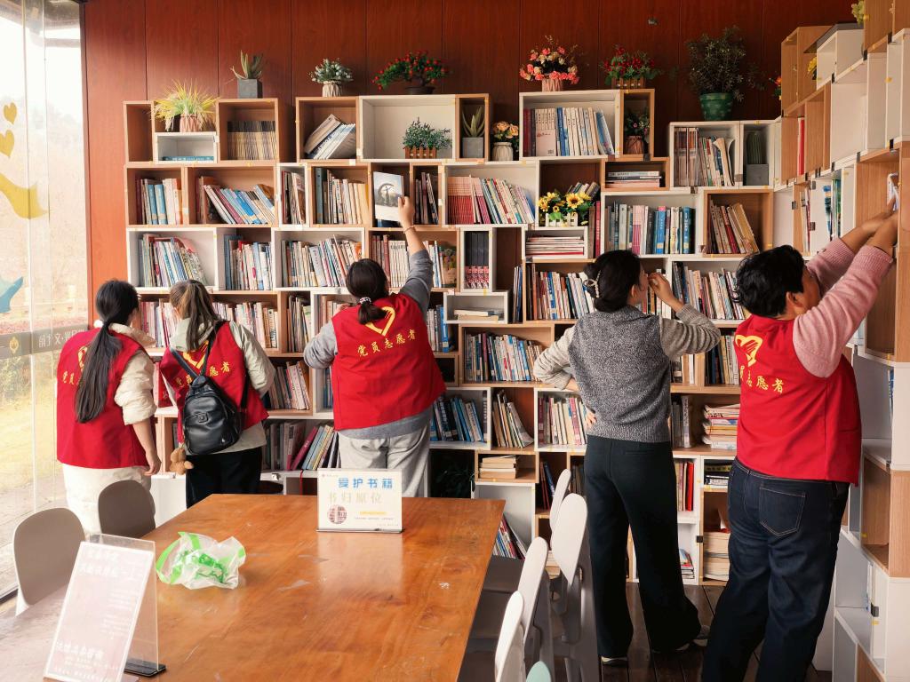 随后,支部成员前往滩下社区“一米月光”书屋开展爱心志愿服务。大家分工协作、热情投入,整理书架、擦拭桌椅、清扫垃圾,让书屋愈发窗明几净、书籍摆放井然有序,为社区居民打造了更舒适的阅读环境。大家认为,节日里的志愿服务,既是党员联系群众、服务群众的生动实践,更是以实际行动诠释党员先锋模范作用的具体体现。