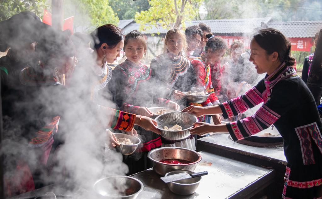 在现场,鲜红的五星红旗高高飘扬,节日祝福标语高挂屋檐。灶台旁,同学们热火朝天,干劲十足,七个柴火灶热气腾腾,地道的彝族美食坨坨肉香气四溢。广场上,优美的旋律响起,学生们和老师们手拉手,肩并着肩,围着篝火跳起彝族传统舞蹈达体舞,大家跺着脚拍着手,欢呼声和欢笑声交织在一起,喜庆、温馨、愉快的节日氛围弥漫开来。