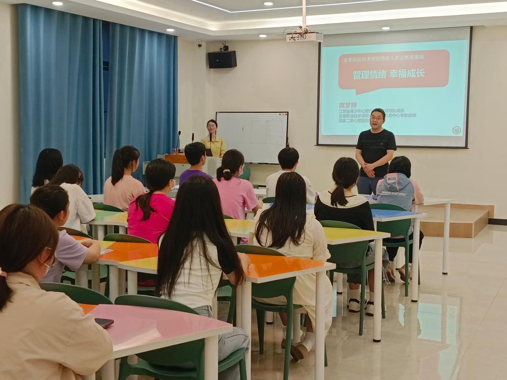 本站讯(继续教育学院  熊瑶)5月19日晚,宜春职院残疾人职业教育基地、学工处在日新楼二楼心理健康教育中心联合举办“管理情绪 幸福成长”残疾学生心理知识讲座。这是职业教育活动周活动内容之一,也是为迎接第三十三次全国助残日开展的活动。继续教育学院副院长文灏主持此次讲座,讲座由学工处心理健康教育中心主任席梦婷主讲。