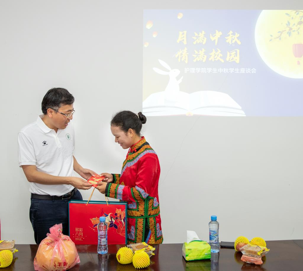本站讯(护理学院 胡蓉)又是一年月圆时,万家灯火庆团圆。为缓解学子们的思乡之情,传递学校关爱,9月9日上午,党委副书记、校长邱军,教务处处长熊杰平走访慰问了护理学院学子,护理学院班子成员、辅导员、家庭经济困难学生、少数民族学生、班级学生代表参加了座谈会,会议由护理学院党总支书记胡蓉主持。