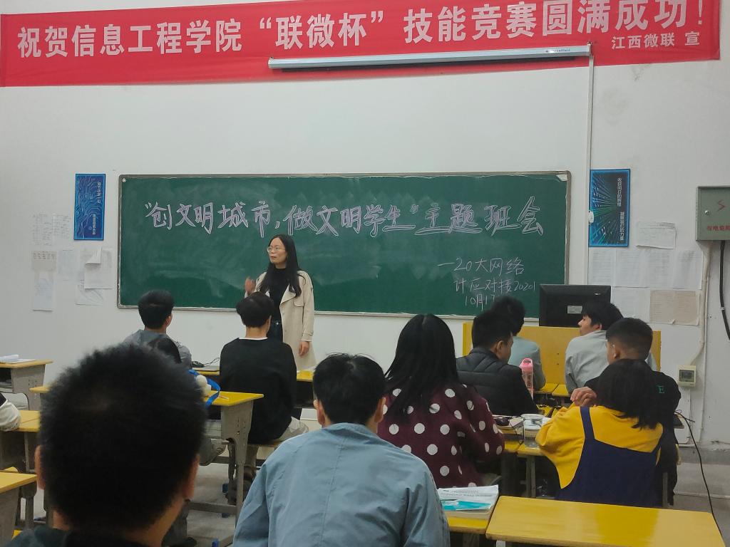 为了进一步落实我市创文”工作,推动全校学生文明意识的提高和文明行为的养成,提高学生综合文明程度,营造整洁、有序、和谐的校园氛围10月17日晚,信息工程学院开展创文主题班会。