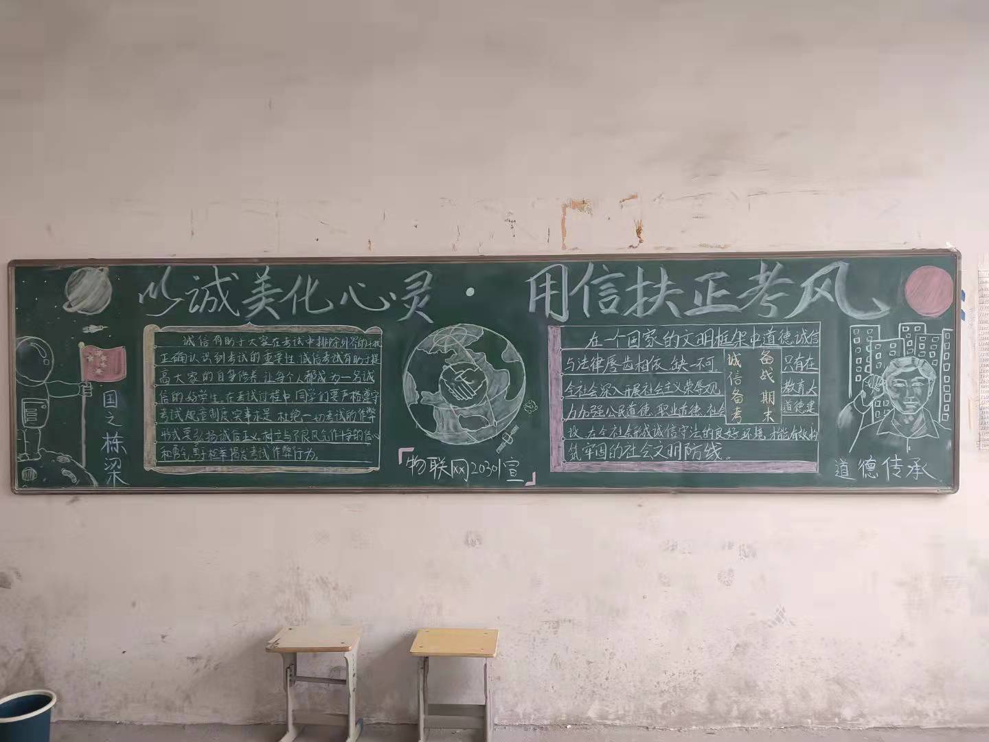 本站讯(信息工程学院刘嘉妮 学生记者柳晓)为了加强班级文化建设,建设文明校园,营造学院诚信的氛围。12月28日,信息工程学院开展主题为“以诚美化心灵,用信扶正考风”黑板报评比活动。