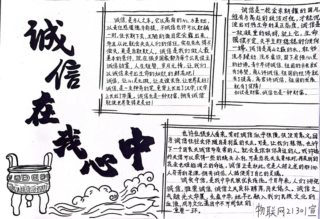 本站讯(信息工程学院 李纪杨)为落实创新资助育人形式,引导全院学生树立诚信理念,营造学院诚信氛围。信息工程学院于2022年5月开展了以“诚信在我心中”为主题的手抄报征集活动。