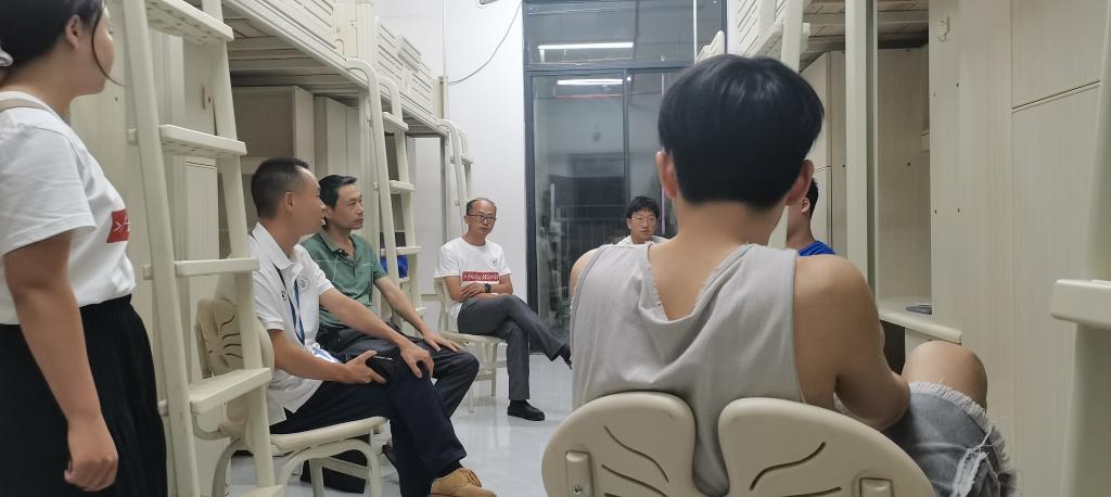 在寝室里,老师们询问每位同学的报到情况、家庭状况,了解学生入校后的适应情况和对专业的了解程度,在闲话家常中拉进与新生的距离,同时叮嘱学生入校要尽快调整状态,学好专业,另外要注意寝室安全,谨防诈骗。