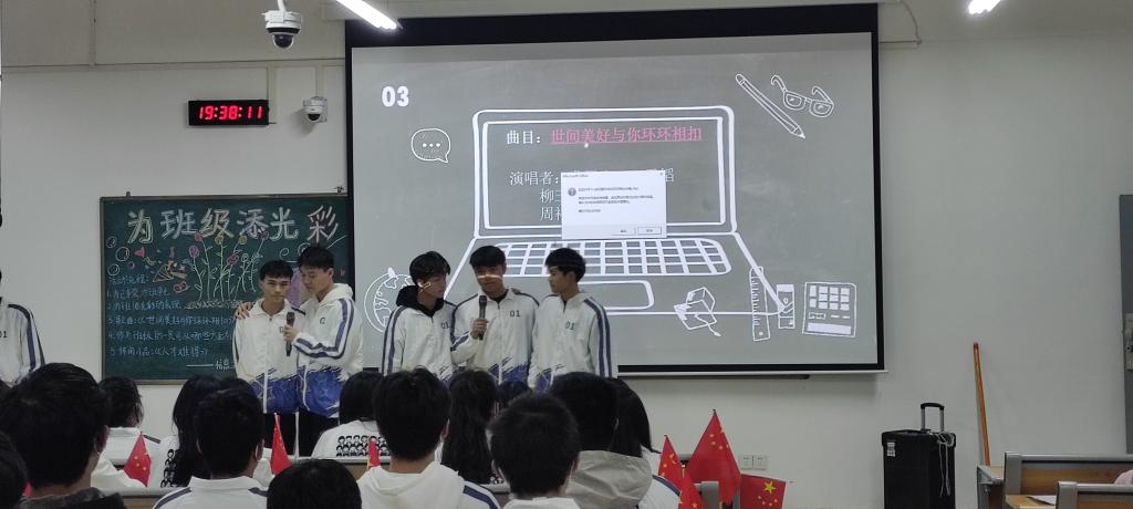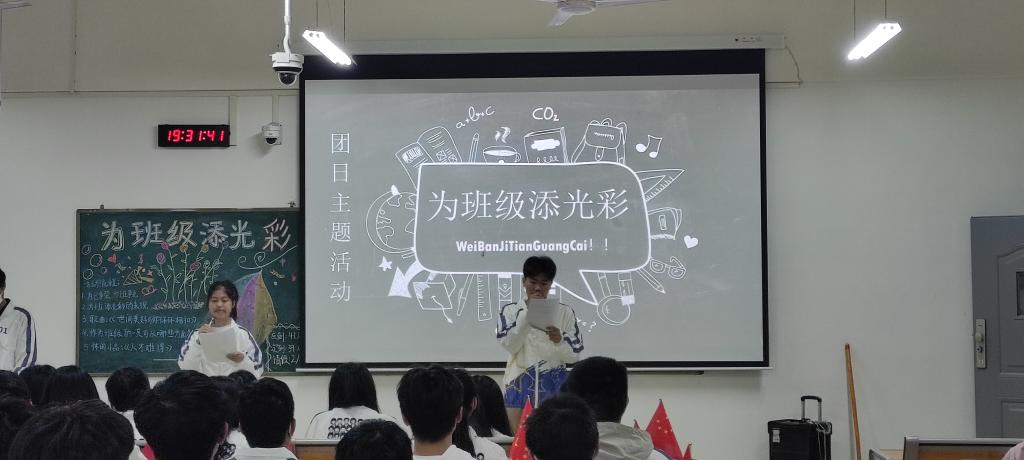 活动开始,由团支书易文强同学主持,活动围绕“为班级添光彩”主题开展,向同学们讲解如何能为班级贡献一份力量,为班级增添光彩。活动过程中,团支部开展歌唱、小品、知识竞答等环节,现场气氛活跃、轻松愉快,让同学们更好的意识到班级需要每一位同学共同爱护,要为班级增添光彩贡献自己的一份力量。