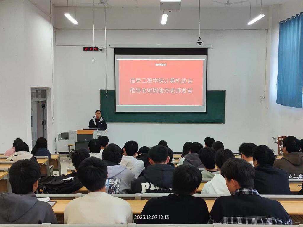 本站讯(信息工程学院 黄彪 学生记者 黄静薇)为进一步促进计算机协会发展,12月7日,信息工程学院计算机协会在智云楼B102教室召开十二月全体大会,会议由会长袁佳雯主持,指导老师周俊杰及全体协会成员参加。