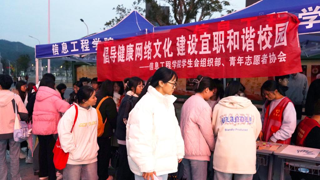 本站讯(信息工程学院 黄彪)为推进网络文明建设,营造健康的网络环境,11月22日,信息工程学院学生会和青年志愿者协会在东区食堂前开展“倡导健康网络文化 建设宜职和谐校园”主题活动。