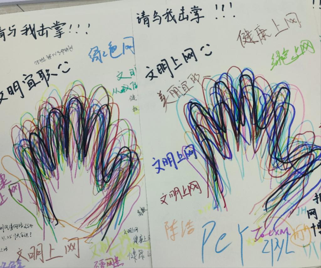 活动现场,同学们热情高涨,纷纷拿起画笔,在纸上精心描绘自己的手掌轮廓,同时在旁边写下他们对倡导健康网络文化,共同建设美丽和谐宜职校园的建议、“文明上网、绿色上网、不沉迷网络、不参与网络赌博”等倡议文字。一双双色彩明丽的手掌轮廓印在洁白的卡纸上,卡纸顿时变得五彩斑斓起来。此次活动不仅创作了艺术作品,同时也传递了营造健康网络环境的意义。