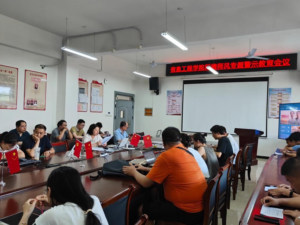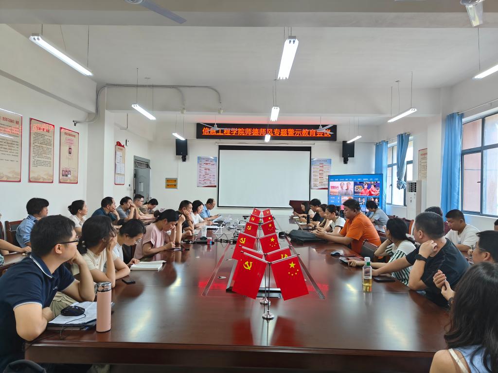本站讯(信息工程学院 谢小欣)为进一步加强师德师风建设,引导全体教师恪守师德底线,不断提升教学质量和教育水平,6月21日下午,信息工程学院在智云楼B501召开师德师风专题警示教育大会,会议由副院长陈根金主持,学院全体教师参会。