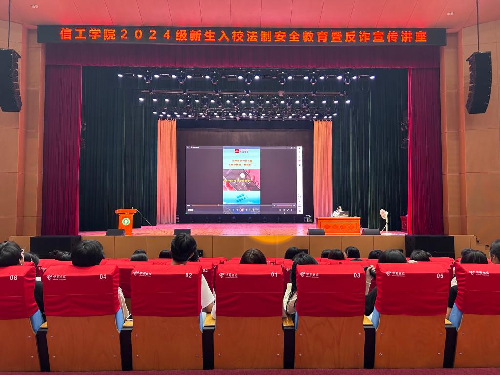 本站讯(信息工程学院 王乐)为普及安全与法律知识,9月12日下午,信息工程学院在出彩大会堂开展新生入学法制安全教育暨反诈宣传讲座。本次讲座邀请到学院派出所陈娟警官主讲,全体新生参加。