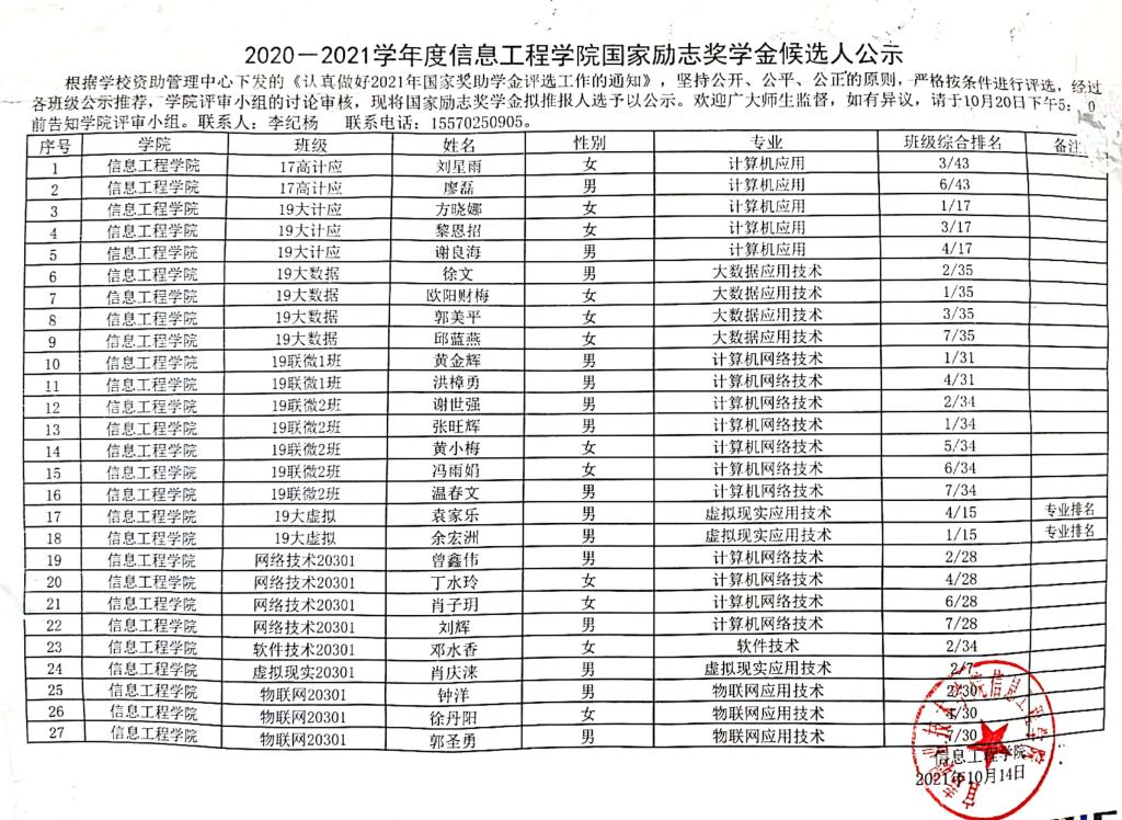 根据学校资助管理中心下发的《认真做好2021年国家奖助学金评选工作的通知》,坚持公开、公平、公正的原则,严格按条件进行评选,经过各班级公示推荐,学院评审小组的讨论审核,现将国家励志奖学金拟推报人选予以公示。欢迎广大师生监督,如有异议,请于10月20日下午5:00前告知学院评审小组。联系人:李纪杨 联系电话:15570250905。