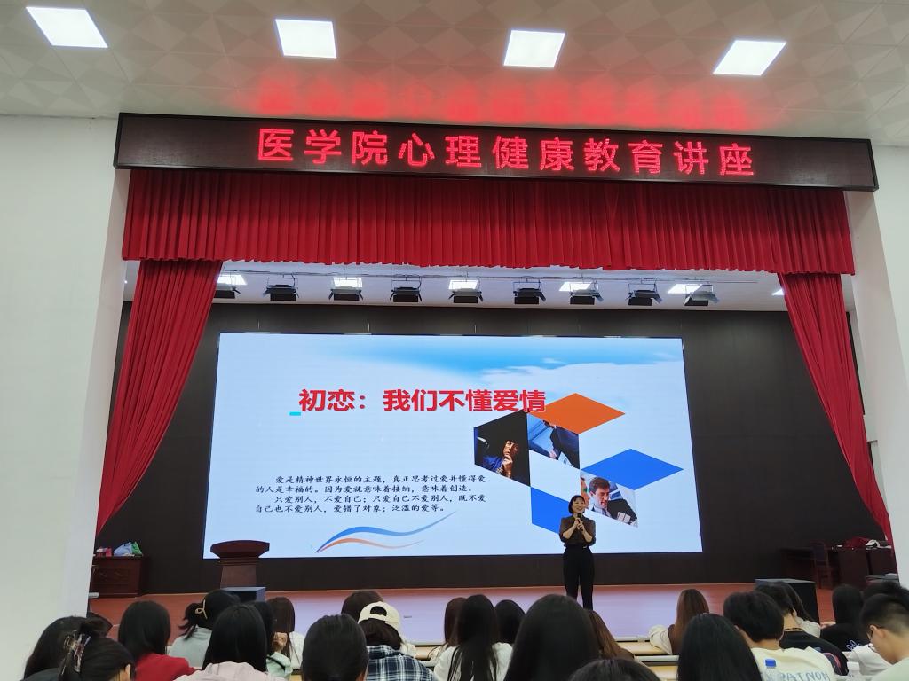 为进一步提高大学生心理健康教育工作的针对性和时效性,引导大学生树立正确的爱情观,提升大学生在人际交往中自爱与爱人的能力,6月4日下午,医学院(附属医院)邀请校心理健康教育中心龚春芳老师开展以“初恋,我们不懂爱情”为主题的大学生恋爱指导讲座,与同学们一起探讨青春期的懵懂爱情。学院2023级400余名学生参加讲座。