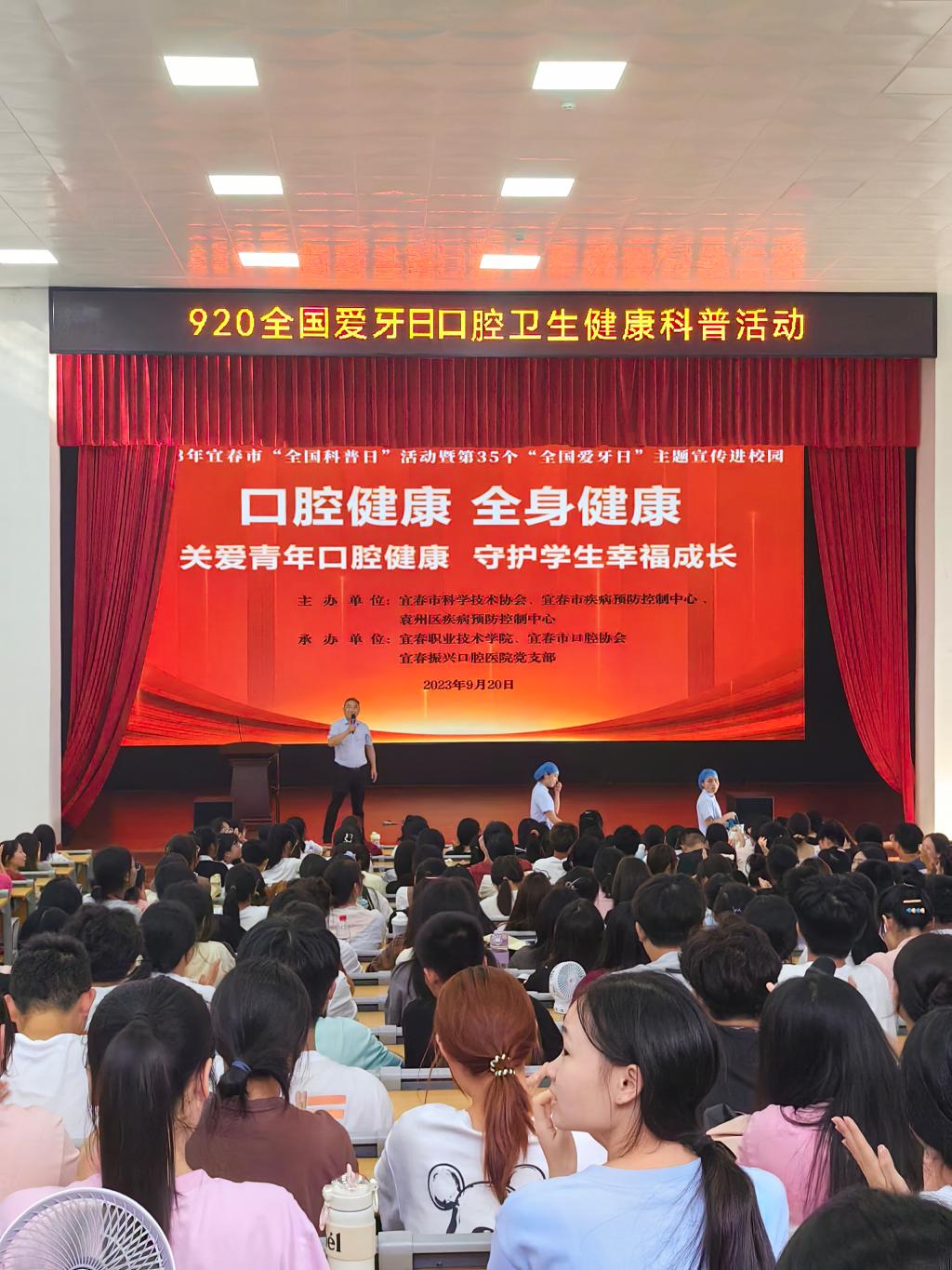 第35个全国爱牙日来临之际,9月20日,医学院(附属医院)在仁济楼演播厅开展920全国爱牙日口腔卫生健康科普活动。本次活动由医学院(附属医院)主办,宜春泰康拜博口腔医院、振兴口腔医院协办,红十字社团、青春健康同伴社、医疗志愿者协会及医学院、护理学院学生共1000余人参加。