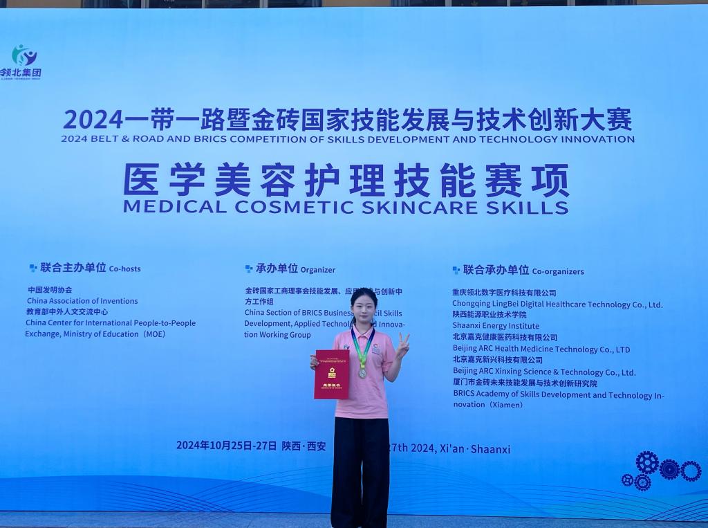 10月25日至27日,2024年“一带一路”暨金砖国家技能发展与技术创新大赛之医学美容护理技能赛项在陕西能源职业技术学院举行。英国上市公司365医学院医学美容技术专业学生彭倩宇凭借扎实的理论功底、精湛的实践技能和顽强的拼搏精神,在全国179名参赛选手中脱颖而出,荣获国赛二等奖。