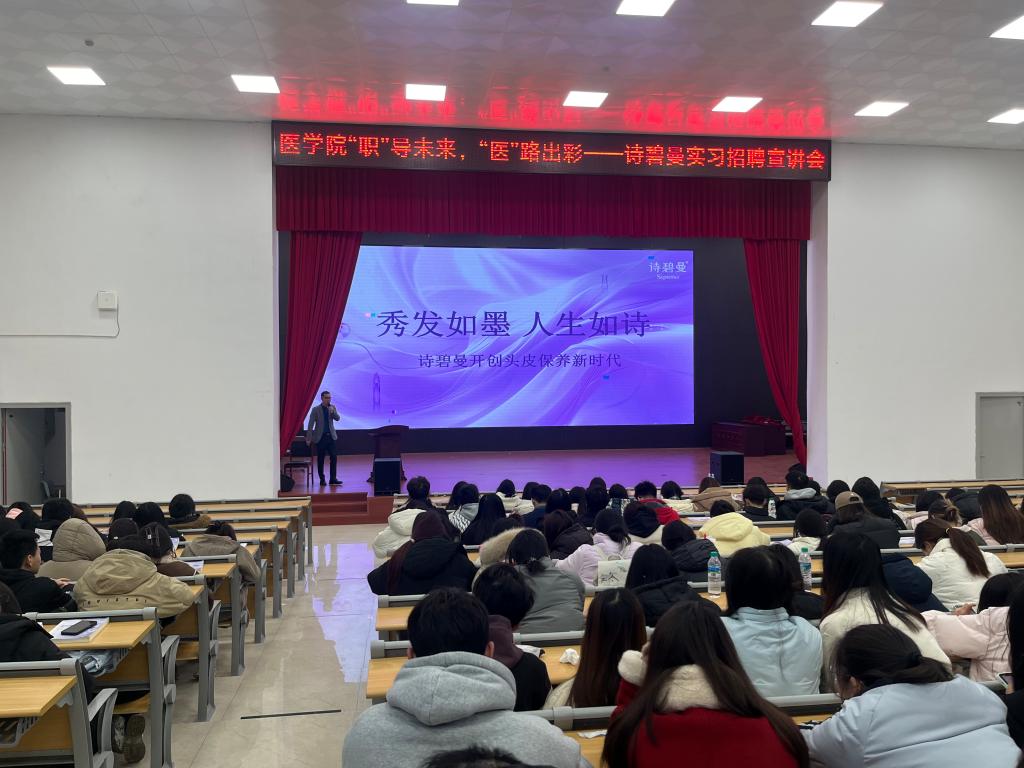 为深化校企合作,拓宽毕业生实习就业渠道,搭建起与企业面对面的交流平台,2月25日下午,医学院在仁济楼小礼堂召开校园招聘宣讲会。本次招聘宣讲会邀请到深圳市诗碧曼科技有限公司校企合作负责人张名择进行讲座分享,为学院学子未来职业发展打下坚实的基础。讲座由实习就业干事朱宁主持。