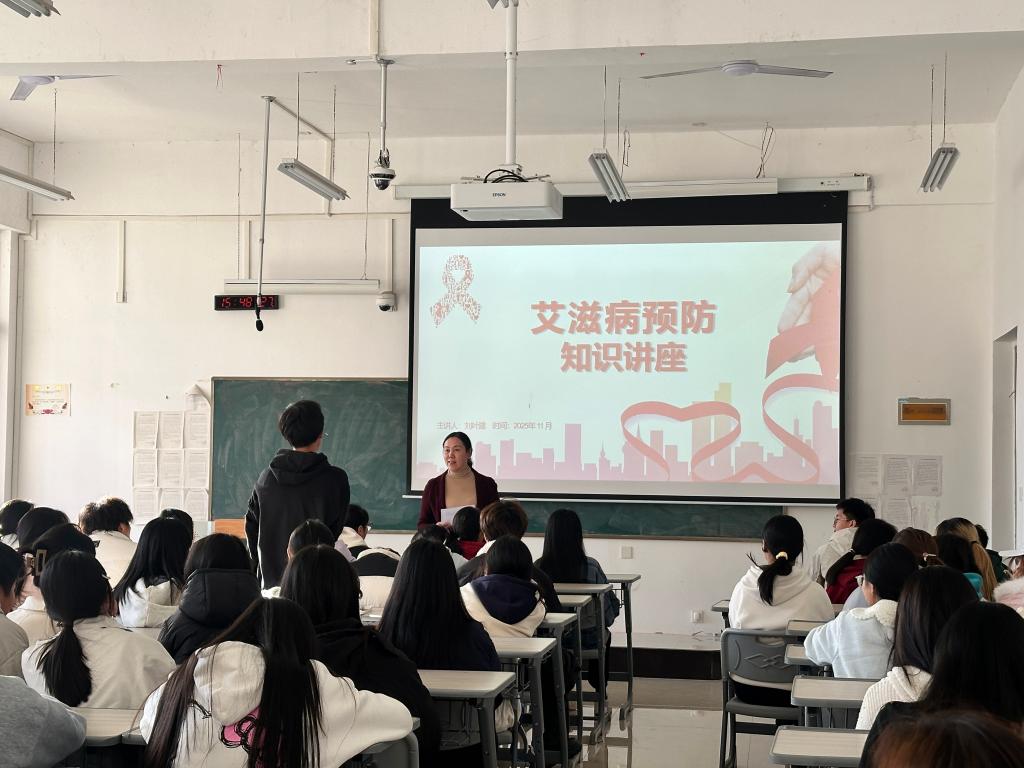 校党委委员、副校长刘叶建率先垂范,为防艾教育“打头阵”。刘叶建走上讲台,围绕艾滋病的流行现状、传播途径、科学防护、灭活途径等核心内容开展专题授课,用权威解读破除认知误区,强调青年学生在防艾工作中的责任与担当,引导师生树立“健康第一”的生活理念。全校各班级同步开展预防艾滋主题班会,通过案例分析、互动讨论等形式,让同学们在轻松的氛围中深入学习防艾知识。