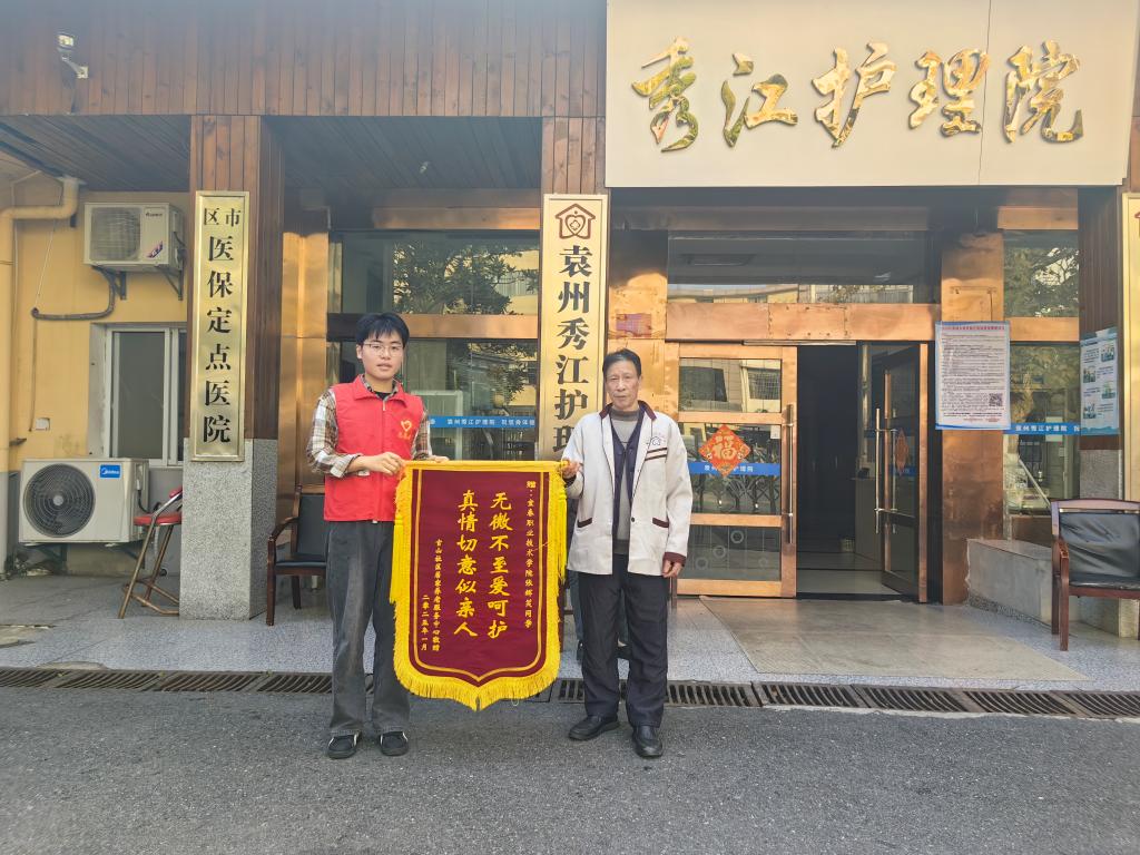 2025年1月,医学院药学24302班张辉笑同学,因在志愿服务中表现突出,收到了来自秀江护理院赠送的锦旗,锦旗上“无微不至爱呵护,真情切意似亲人”十四个大字,既是对学子志愿服务的高度肯定,也是我院立德树人教育成果的生动体现。
