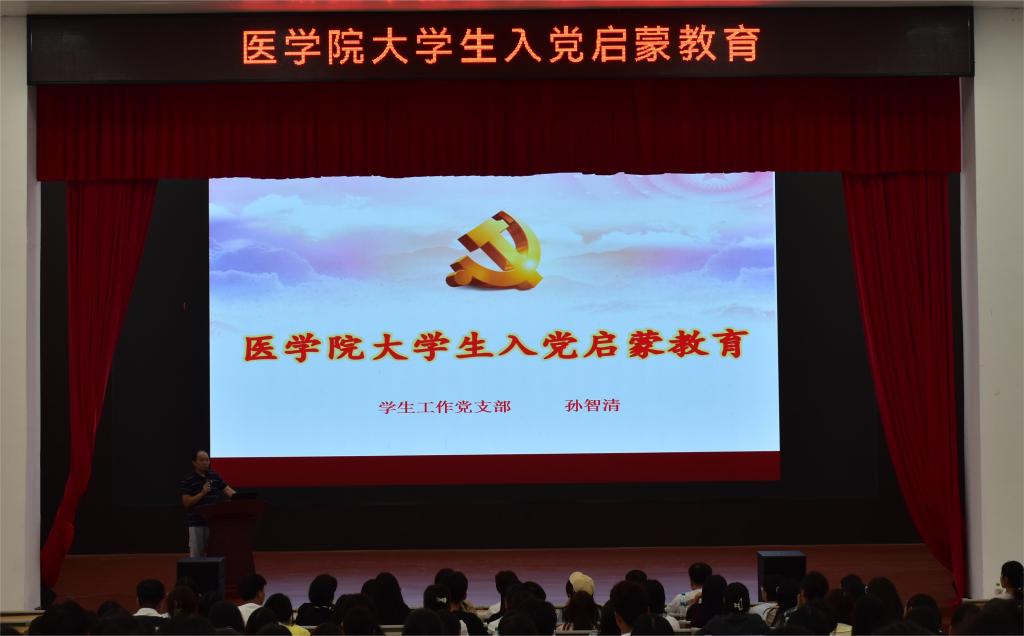 为深入学习贯彻党的二十大精神,推动习近平新时代中国特色社会主义思想入脑入心,引导青年学子厚植爱党爱国的情感,推进“四强”党支部建设,9月21日中午,医学院党总支在仁济楼小礼堂开展“党的基本知识教育”之大学生入党启蒙教育。主讲人为医学院学生工作党支部书记孙智清,学生工作党支部全体党员、入党积极分子以及新老生代表共计320余人参加。